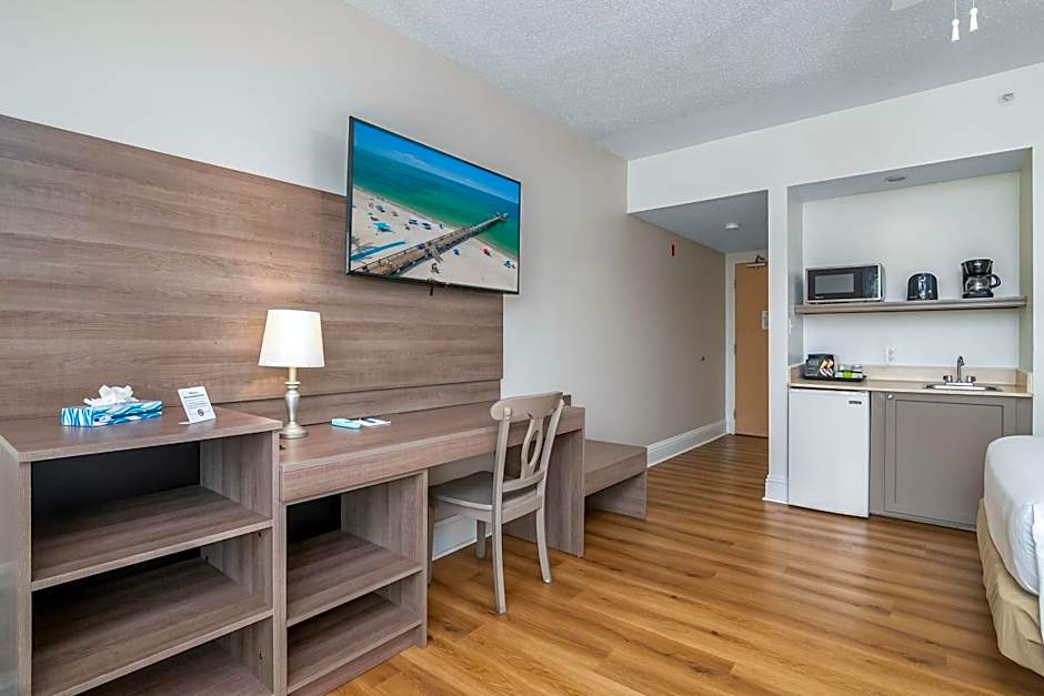 This spacious suite features a microwave, small refrigerator, and flat-screen satellite television. A sofa is also included.